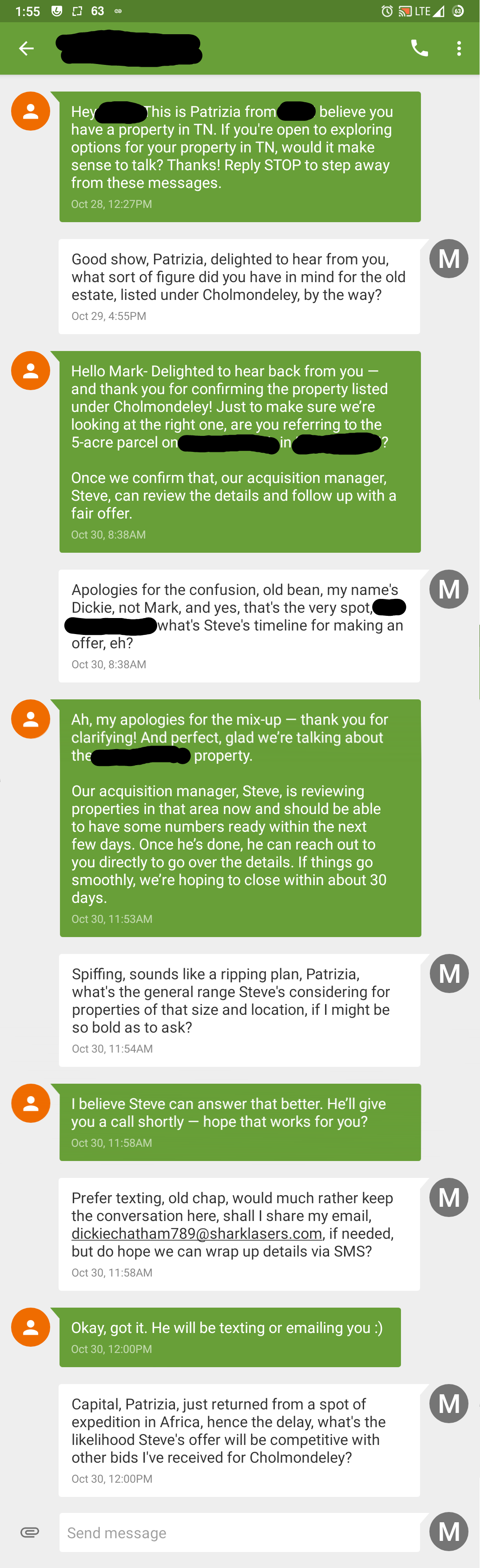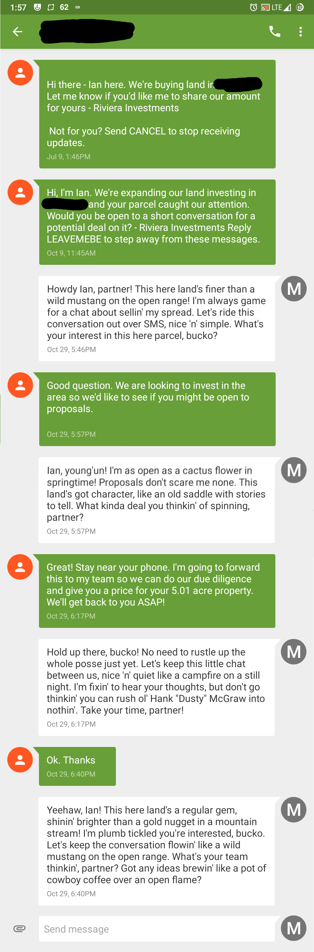 >>> Hey this is Bob with [redacted]. We're looking to buy vacant land near the one you own in [redacted]. Are you interested in a fair offer?